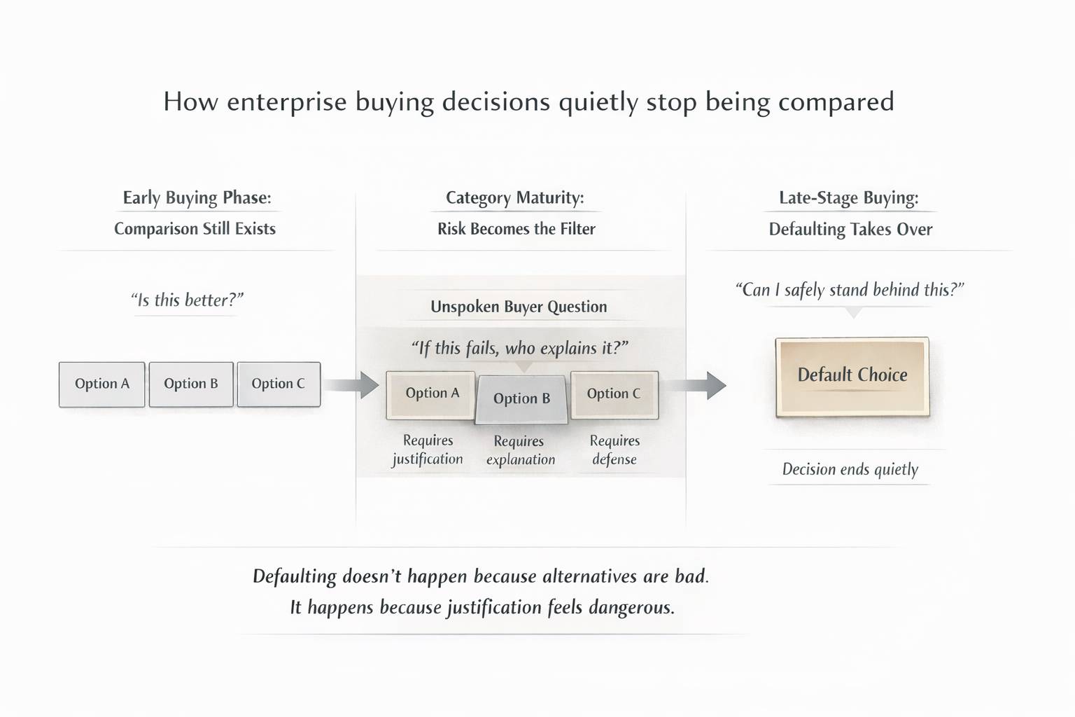 Options multiply. Differences blur. Time shrinks. The cost of being wrong begins to feel higher than the benefit of being right. In that environment, comparison becomes work, and work becomes risk. So buyers simplify, not because they do not care, but because they care deeply about defensibility. This is where defaulting begins.