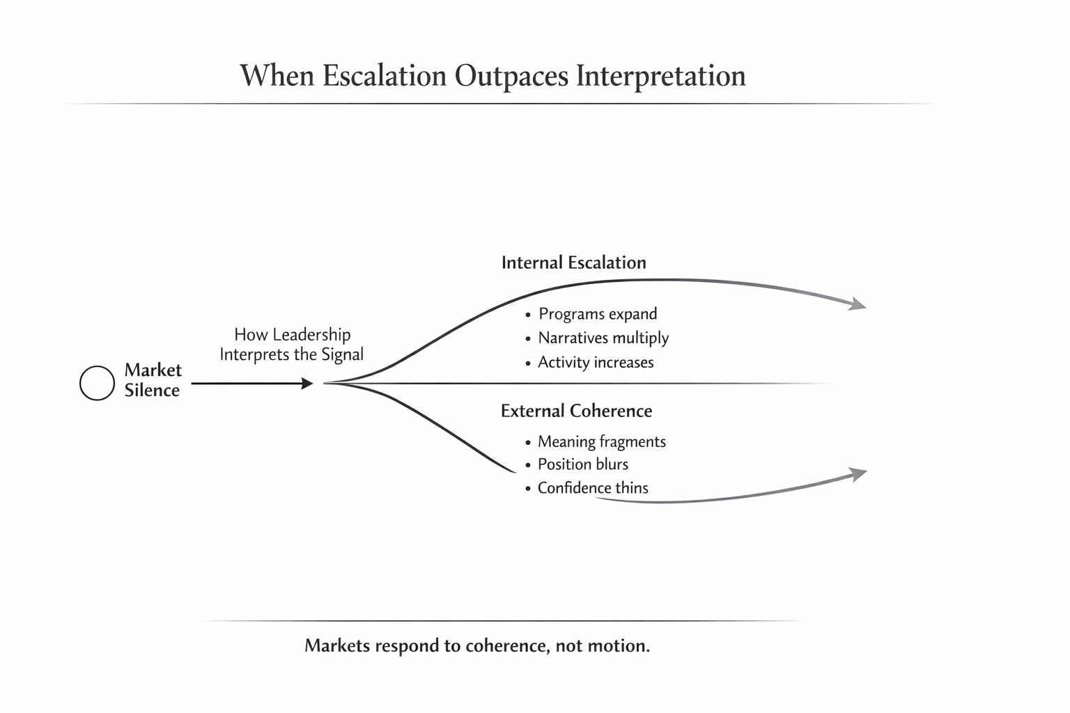 Markets, however, do not respond to effort in the same way organizations do. They respond to coherence. When silence is interpreted as confusion, escalation becomes the default response. The organization moves faster, while the meaning behind that movement becomes harder to track externally.
